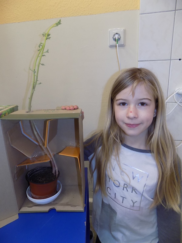 Leni und Hanna beobachteten in den Ferien, wie die Kartoffel zum Licht wächst. Ihr könnt sehen: erst dann wird der Stängel grün! Dazu bauten sie (freiwillig) aus einem Karton ein Labyrinth, durch das sich die Pflanze, ohne dass der Karton geöffnet wird, zum Licht (ein eingeschnittenes Loch) hin orientieren muss. Das funktioniert, wie die Bilder beweisen!