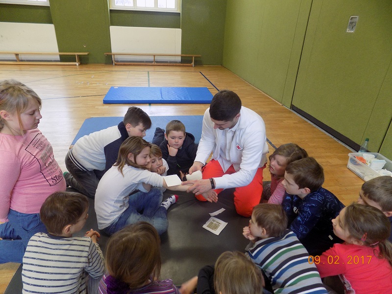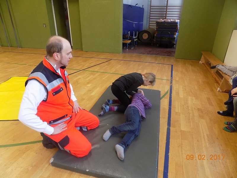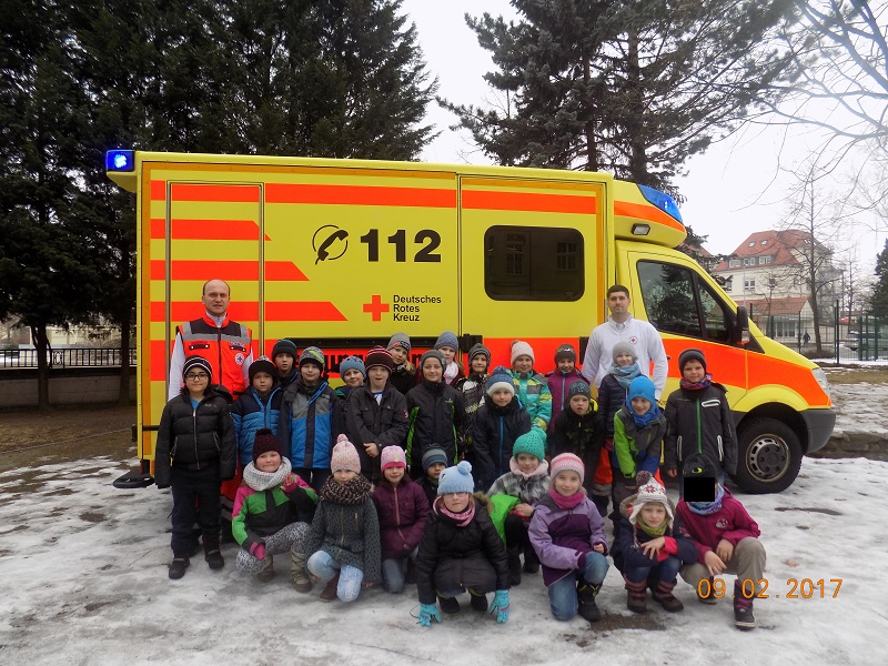 Am 9.Februar 2017 führten die 2.Klassen ihren Projekttag zum Thema „Erste Hilfe“ durch. Die Rettungssanitäter Marcel und Maik zeigten uns den Rettungswagen und erklärten uns viele Maßnahmen zur Soforthilfe.