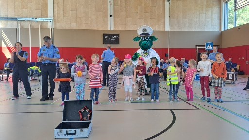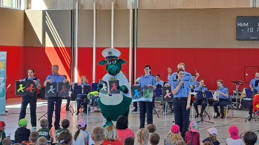 Poldi erklärte den ersten Klassen das richtige Verhalten beim Überqueren der Straße. In dem Musikstück „Mein Weg zur Schule“ erleben Frieda und Emma einige Abenteuer.